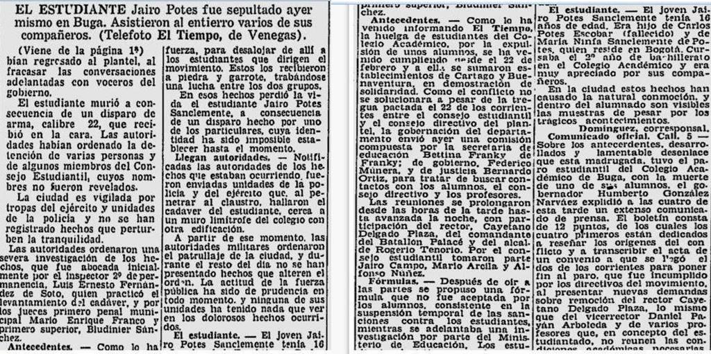 Después de escuchar este relato, algunos compañeros propusieron tratar de retomar el plantel. Nos dividimos en varios grupos, por las cuatro esquinas que desembocan al colegio, el cual se encontraba rodeado de policía. Avanzamos enfrentado a la policía con piedras por algunas horas. Fracasado este intento, pensamos en reclamar el cadáver de Jairo Potes. Averiguamos donde lo tenían. En ninguna parte daban razón de él. Tenían la intención de enterrarlo secretamente para evitar disturbios. Nos dirigimos al cementerio a esperar vigilando todas las calles que conducen a este.
