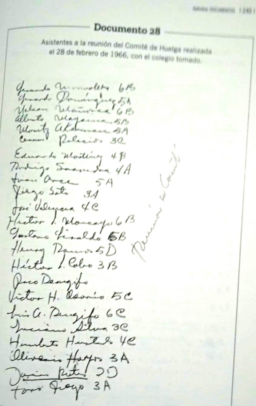 Al día siguiente, nos levantamos temprano y esperamos las siete que era la hora de entrada. Empezaron los murmullos, los gritos y los golpes en la puerta. Afuera, los compañeros anunciaban el inicio de la huelga y trataban de impedir que alguien entrara. Se formó un alboroto que no podíamos observar ni oír en forma clara. A eso de las 10 de la mañana, un grupo de estudiantes que no apoyaban la huelga, se treparon a una de las ventanas del segundo piso y lograron entrar, encabezados por un compañero de apellido Ríos. Estaban muy disgustados y procedieron a abrir todas las puertas de entradas.